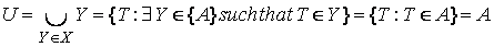 [ZF3] (The axiom of union) For every set X, supposed to contain at least two distinct objects (sets), there exists a set U, which exactly consists of the elements of the objects of X, i.e.