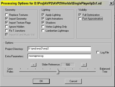 If you encounter polygons that are detail 1 which seem to disappear when you process the level, you may be facing the dreaded splitweight problem. When you use a large number of angled polygons, the depth of the BSP can become too great, and the processor will throw away polygons. You can compensate for this by adjusting the slider bar in the processor, which controls the splitweight value. Don't ask me what this means. When I ask the programmers what this does, their alien language frightens and confuses me, and I retreat back into my cave, grunting territorially and shaking my biggest tree branch at them. I can't even really tell you what direction to try adjusting it or how far - just that messing with it might save you if you are using lots of detail 1 geometry and some of it begins to mysteriously vanish.