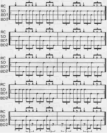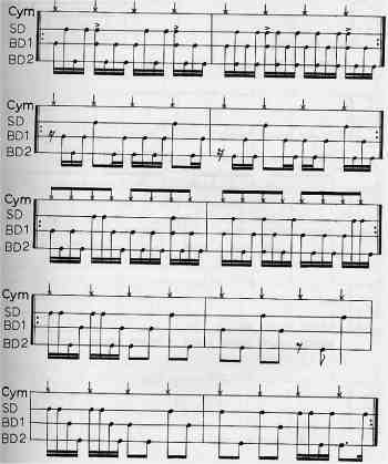 Excerpt 4 shows the use of a second Bass Drum in a more familiar application -