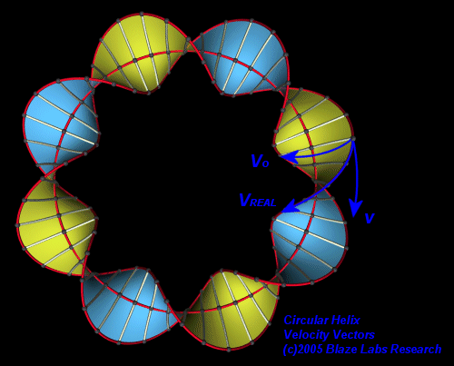From the particle section discussion, we know that matter (defined as having mass) is made up of standing waves. The below picture shows a simple form of matter made up of a helical standing wave. A pair of helical waves is all required to generate matter. All elementary particles should be of this form, yes, whether it is an electron, an atom, a quark or any other newly discovered particle it will be of this form. An electron is such example. The positron is exactly the same but goes backwards in time. All it means is that v,Vo and VREAL point to the opposite directions. The spin is simply v.