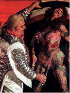 Based upon René Daumal's unfinished novel Mount Analogue and The Ascent of Mt. Carmel by St. John of the Cross, The Holy Mountain (1973) continues Jodorowsky's quest for illumination and critique of consumerism. A Christ-like Thief awakens to find a partial-limbed dwarf befriending him. Together they enter a city where white tourists gleefully photograph students being massacred by soldiers, men dance with police in gas masks, and religious icons are offered for sale. There they watch a miniature reenactment of "The Conquest of Mexico" (an allusion to Artaud, who wrote a similar play (28) using toads and lizards dressed as Aztecs and conquistadors; armed with Christian crosses, the conquering toads march from their three ships to the tune of a Nazi march before blood pours from the pyramids and the whole set explodes. After more strange and blasphemous episodes, the Thief ascends a giant pillar and discovers inside the lair of the Alchemist (played by Jodorowsky). After the Alchemist turns the Thief's excrement into gold, he offers to do likewise with the Thief's soul, introducing in a series of vignettes the most powerful industrialists and politicians in the world - thieves of a greater kind who will embark upon a spiritual journey together. One sells masks and padding to change people's superficial appearance (including electrode implants to animate bodies in death); another sells drugs to turn innocent people into killers (reminiscent of LSD tests on American troops) and mystical weapons for the counterculture's marches and sit-ins; another mass-produces art and creates a female sex machine; another uses government data to create war toys for conditioning children to fight in future wars (e.g. casting Peruvians as "hyper-sexed brown native vampires" defeated only by crosses the colour of white skin); another is a chief of police who initiates troops by castrating them; yet another is an architect who sells coffin-shaped sleeping shelters instead of houses.