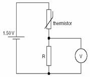 A thermistor has resistance 3900 W at 0 °C and resistance 1250 W at 30 °C. The thermistor is connected into the circuit of Fig. 8.1 in order to monitor temperature changes.