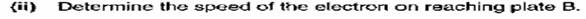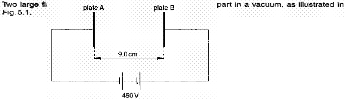 The diagram shows an electron in a uniform electric field. In which direction will the field accelerate the electron?