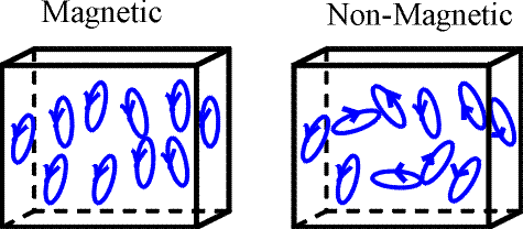 The electrons in the atoms, acting like tiny bar magnets with north and