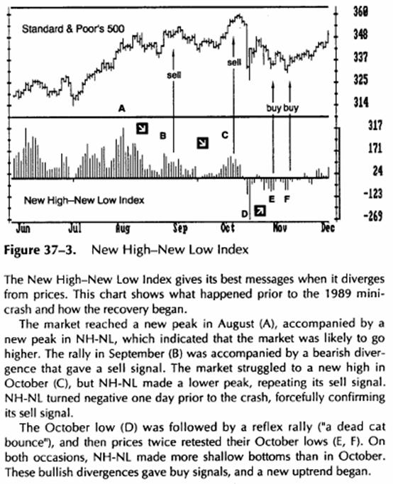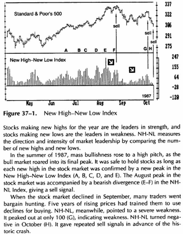 The New High-New Low Index tracks the strongest and the weakest stocks on the exchange and compares their numbers. It measures the balance of power between the leaders in strength and the leaders in weakness. This is why NH-NL is a leading indicator of the stock market. The broad indexes, such as the S&P 500, tend to follow the trend of NH-NL (Figure 37-1).