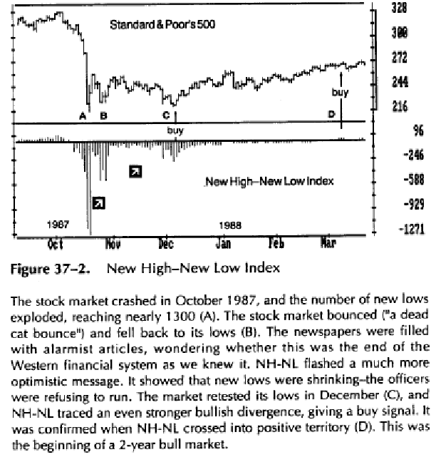 A new low in NH-NL shows that the downtrend is likely to persist. If officers are running faster than men, the regiment is likely to be routed. If stocks fall but NH-NL turns up, it shows that officers are no longer running.