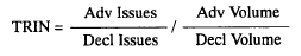 ratio of advancing to declining volume is 4:1, then TRIN equals 0.50 (2/1 + 4/1). A