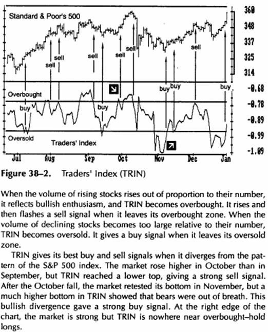 The stock market is a manic-depressive beast -it swings from expansive mania to fearful depression. The mood of a manic-depressive patient goes through cycles. When he reaches the bottom of depression, his mood starts to improve. When he rises to the height of mania, he starts to slow down. Traders can use TRIN to diagnose manic and depressive episodes in the stock market and bet on their reversals (see Figure 38-2).