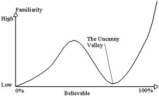 The tendency in the graph is clear: either produce a complete replica of a human or aim at the local maximum. The "valley" in the graph is referred to as the uncanny valley because agents in this area seem uncanny to human users after inspection.