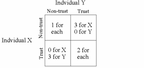 The prisoner's dilemma (see [39] and ) is an example of such a problem. The idea is that two people individually have to make a decision whether to trust the other. If neither trusts the other then they both get little benefit. If one trusts and the other does not then the person that does not trust receives all benefit. However if the two persons trust each other then they both get an average benefit. This is illustrated in Figure 15. Here the higher value the more benefit.