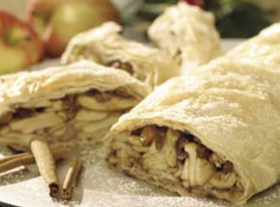 Bake in oven (pre-heated to 200° Celsius).Once the strudel has a nice brown color, reduce the temperature to 150°. The baking time is approximately 25-30 minutes