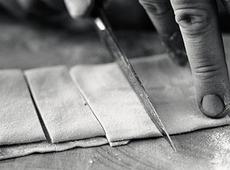 Cut the sheets to about the length of a shoebox. Fold them over twice, making sure you have dusted them generously on both sides with flour. Now cut into slices approximately 4cm/1 1/2 inches wide (see picture on left) and you have your pappardelle. Remember to gently toss and jiggle the pappardelle around to separate the lengths of pasta once you have cut them. This will remove any excess flour.
