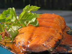 Place the cedar plank down on the heated grate. Close lid of bbq and wait for ceder plank to start smoking. Once it is smoking place the salmon on top of plank, close the lid and let cook for 15 minutes until the flesh is just translucent in the centre of fish. The cedar plank will smoulder; make sure it does not catch fire by spraying water on plank if necessary. When salmon is cooked to desired doneness carefully remove salmon from grill using tongs or a large spatula. Serve directly on plank for a outstanding presentation.