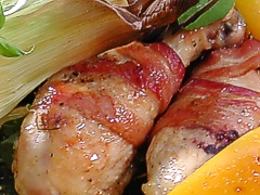CHICKEN DRUM STICKS WRAPPED IN BACON 24 toothpicks 24 chicken drumsticks, washed and dried 2 teaspoons of ground pepper (10ml) 1 pound of bacon ½ cup of olive oil (125ml)