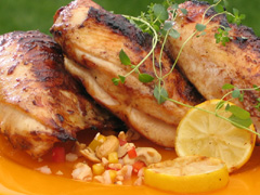 Remove the chicken from the grill and tent with tin foil. Let the meat rest for 5 minutes before serving. Add the nuts and mint to the relish and serve on top of chicken.
