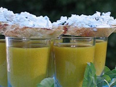 To plate: fill shot glasses with the soup and top with crostini.