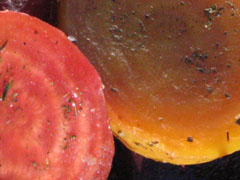 Peel and slice the beets and put into a sealable plastic bag. Add balsamic vinegar, garlic, rosemary, herbes de Provence and celery salt.