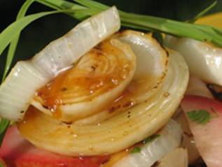 Preheat grill to medium heat. Oil grill and place onions on to cook for 3 minutes. Flip the onions over and baste with the apricot glaze and continue to cook a further 2-3 minutes.