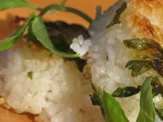 Using a 3 inch ring mold. Mold rice in the ring cylinder until it is about ¾ inch in height. Gently pack in until a nice firm disk is achieved. Tip: To stop rice from sticking to your hands; dip your hands in cold water before handling the rice. Place the cake on a well oiled baking sheet and brush the cakes evenly with the peanut oil.