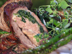 Cut Beef Butt Roast into ½ inch thick slices. Season with salt and pepper. Cover with spinach and drizzle with lemon juice. Place cooled veal mixture over the spinach and roll into individual beef cigars and place on a tray. Use a toothpick to secure if necessary. Drizzle outside with oil and season with salt and pepper.