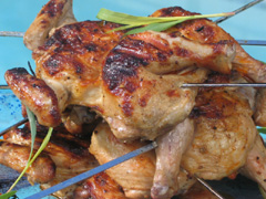 Place hens skin side down on barbeque grill and cook for 15 minutes or until the skin is crispy and rich golden brown in colour. Flip the hens using the skewers as an aid. Continue to cook a further 10 minutes or until there is no trace of pink at the bone.