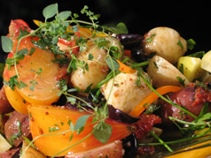 Place the potatoes in boiling water to fully cook them for approximately 12 minutes. Remove from water and let cool slightly. Once cool, cut the potatoes into quarters along with the artichokes and place in a bowl. Add the chopped parsley, diced red onion, and some olives. Add in some olive oil and lightly mix.