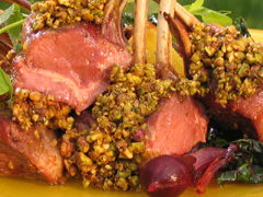PISTACHIO AND HONEY CRUSTED LAMB RACKS 4 lamb racks 5 bones each Season Lamb racks with salt and pepper. |