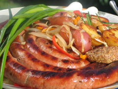 Insert 3 metal skewers into the ring of sausage. This will secure the sausage and provide even handling. Place on to a tray and using a wooden skewer or fork gently poke threw casing of sausage all over the surface (this will stop sausage from busting out of casing while on the grill).