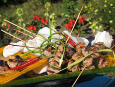 Preheat grill to medium high heat & oil grill well. Thread about 3 pieces of pork onto each soaked bamboo skewer. Grill 4 to 6 minutes over medium heat, turning occasionally, until cooked throughout, and a golden brown crispy exterior is achieved. Transfer pork to a serving platter. Serve with peanut sauce.