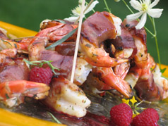 In a medium bowl place shrimp, zest, garlic, dill, and tarragon; toss to coat and add pepper. Cut the Prosciutto slices in half lengthwise. Wrap each shrimp in a half-slice of prosciutto. Brush liberally with the olive oil. Place in the refrigerator for 20 minutes.