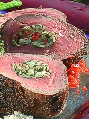 Oil the grill and place the stuffed tenderloin on the high heat to sear for 5 minutes or until a nice crust has developed on the outside of the meat. Reduce the heat to medium high and continue to cook for 15 minutes until desired doneness.