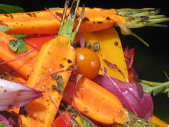 Once cool, chop peppers into bite sized pieces. Remove core from onions so to have petals of onions. Place all vegetables in a bowl and add the fresh tomatoes, parsley and basil.