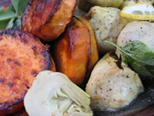 Next, on a sheet of foil place some roasted garlic (see recipe below), top with artichokes and sprinkle with more garlic, oil and salt. Close foil leaving room for steam to vent. Repeat until all of the artichokes are foiled.