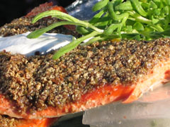 Place package directly on heat source, close lid of bbq. Allow smoke to fill cavity of bbq. This should take about 15 minutes. Reduce heat to 220°F/ 104°C. Leave one side of the bbq off to prepare for indirect cooking. Place salmon trout on a piece of foil that has been brushed with vegetable oil. Place on grill and close lid quickly as to not allow too much smoke to escape.
