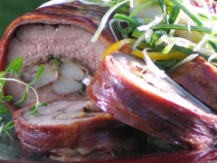 Using the plastic wrap as a guide, roll up the tenderloin so the proscuitto is completely covering the veal loin, tighten plastic wrap around roast and place in the refrigerator for 1-2 hours.