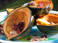 Brush the inside cavity of the squash with ½ of the maple butter that has been melted. Wrap the base of the squash in foil.
