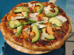 Drizzle olive oil and balsamic onto the flesh of the pitted, peel still remaining avocado halves. Place flesh side down directly on grill and grill for 2 minutes. Remove from heat let cool slightly. Peel the skin off the avocado using a spoon or sharp knife. Slice avocado in thin slices. Place on pizza in a decorative pattern. Slice pizza into wedges and serve hot.