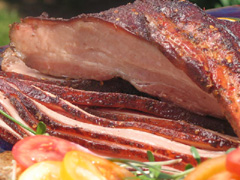 Once pork is smoked and has a beautiful dark colour remove from heat. Place pork on a tray and tent loosely with foil. Let meat rest 15 minutes before carving into thin slices against the grain of the meat.