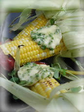 SMOKED CORN ON THE COB AND GARLIC CHIVE BUTTER Place 1 cup of the wood chips in a bowl of cold water to 616n1317g soak. |