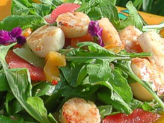Meanwhile prepare the dressing. Place all of the juice from the various fruit into a bowl. Add the remaining ingredients and whisk together. Place in the fridge to set up for 30 minutes. Drizzle over a bed of fresh Arugula and smoked scallops.