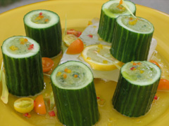 Prepare cucumber by cutting into 2 inch rounds. Remove the seeds and flesh using a melon baller or spoon. (Place scooped cucumber into a bowl). Carve out enough of the cucumber to leave a ½ inch (8 mm) border, along sides and bottom. You should have 10 - 12 mini cups.