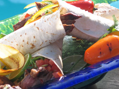 To serve, slice the steak into thin slices across the grain and pile on a plate. Garnish with cilantro sprigs and lime wedges. Serve with warmed soft tacos.