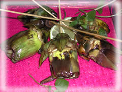 As each artichoke is completed, place it in a bowl of cold acidulated water -