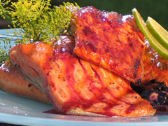 Place steelhead trout fillet down and cook for 2 minutes or until golden char marks are achieved. Flip the trout and continue to cook for 3 minutes. Baste the trout continuously as it cooks. Remove trout from grill when desired doneness is achieved. Serve hot with blackberry sauce and cilantro sprigs.