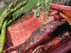 Prepare barbecue for indirect grilling. Preheat grill to medium high heat. Oil grill and place beef on the hot of the BBQ to sear and get grill marks - 5 minutes per side. Move the beef over to the off side and close the lid to cook for another 30 minutes or until the internal temperature reaches 125F for medium rare. Remove from the grill and allow to rest for about 5 minutes.