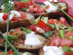 Lay the potato skins out in a row and drop a dollop of bottled salsa in each, followed by sour cream and then chopped jalapeno and roasted garlic. Add grated cheddar and top with chopped chives.