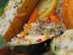 Allow zucchinis to cool slightly. Use a mellon-baller to scoop out centers leaving a ½" border. Chop the zucchini flesh and add it to the bowl of onions and breadcrumbs. Mix well. Add cheese to mixture and diced red pepper. Add the filling back into the zucchini shells and place on a baking sheet for grilling.