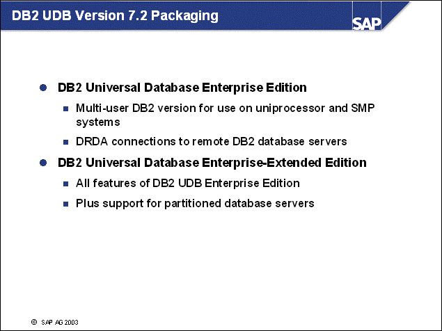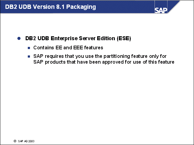 n With IBM DB2 Universal Database Enterprise Server Edition V8.1, SAP delivers all DB2 database servers to be multi-partition enabled. Still, for OLTP systems, there must be one database partition only.