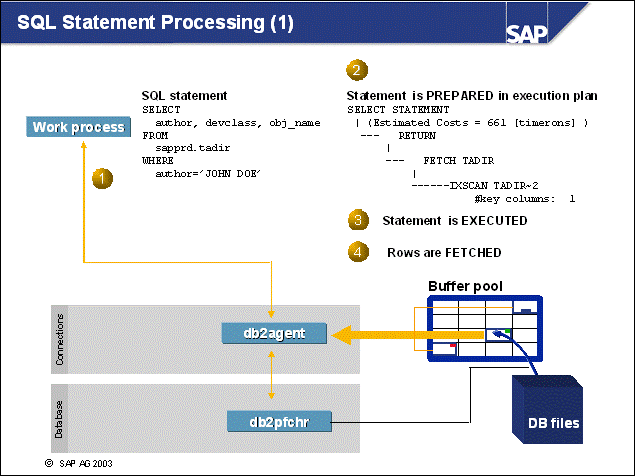 n Via DBI and DBSL, SAP Open SQL requests are transformed into DB2-specific calls of the DB2 Call Level Interface (CLI). CLI operations are typical commands such as PREPARE, EXECUTE, FETCH, and CLOSE.