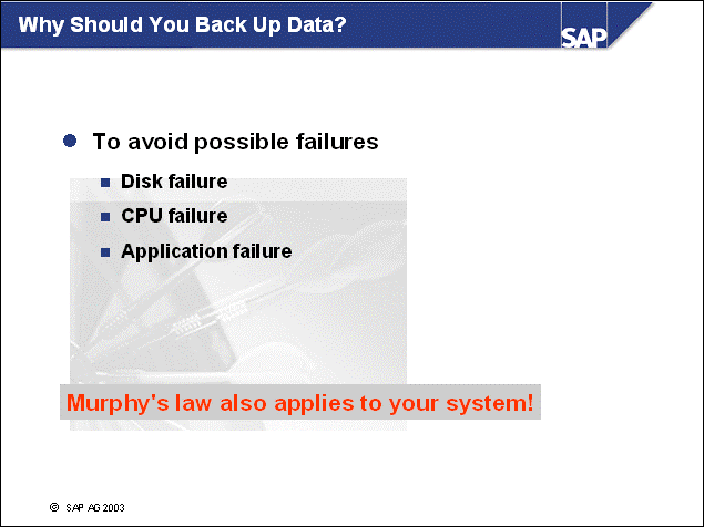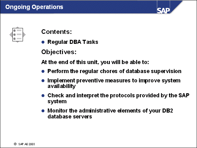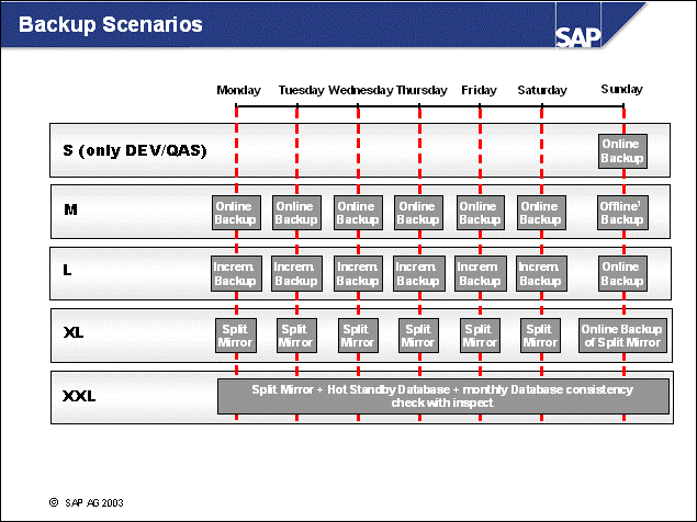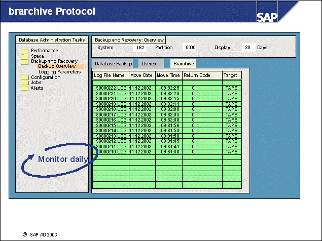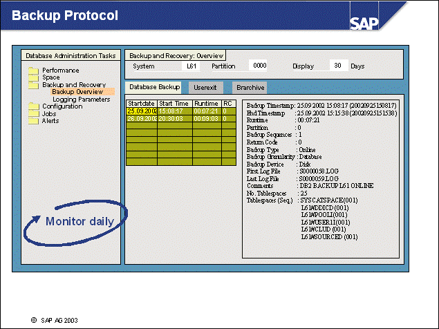 n To view backup information, from transaction ST04, choose Backup and Recovery Backup Overview (transaction DB12). This should be checked daily.